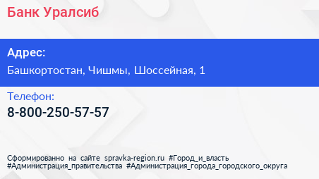 Банк Уралсиб по адресу Башкортостан, Чишмы, Шоссейная, 1 в дальнейшем Организация, размещена в следующих категориях:
