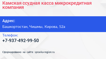 Камская ссудная касса, микрокредитная компания по адресу Башкортостан, Чишмы, Кирова, 52а в дальнейшем Организация, размещена в следующих категориях: