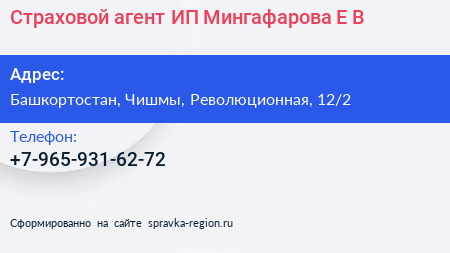 Страховой агент, ИП Мингафарова Е.В. по адресу Башкортостан, Чишмы, Революционная, 12/2 в дальнейшем Организация, размещена в следующих категориях: