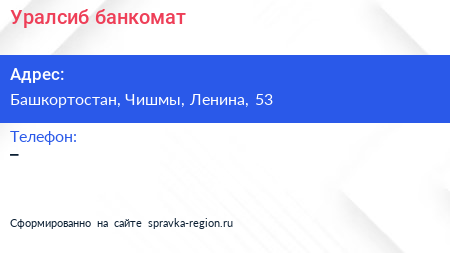 Уралсиб, банкомат по адресу Башкортостан, Чишмы, Ленина, 53 в дальнейшем Организация, размещена в следующих категориях: