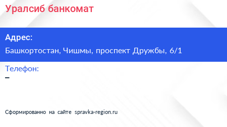 Уралсиб, банкомат по адресу Башкортостан, Чишмы, проспект Дружбы, 6/1 в дальнейшем Организация, размещена в следующих категориях: