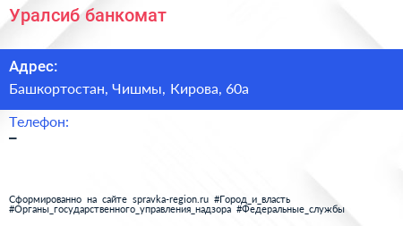 Уралсиб, банкомат по адресу Башкортостан, Чишмы, Кирова, 60а в дальнейшем Организация, размещена в следующих категориях: