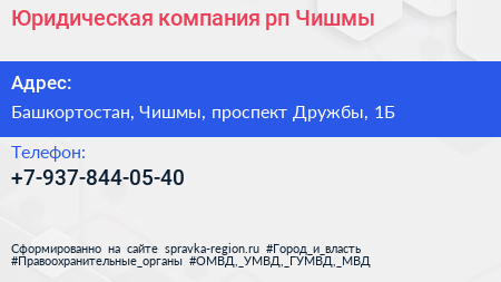 Юридическая компания, рп.Чишмы по адресу Башкортостан, Чишмы, проспект Дружбы, 1Б в дальнейшем Организация, размещена в следующих категориях: