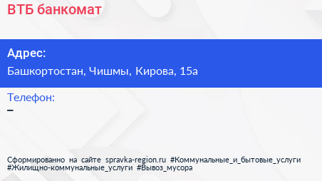 ВТБ, банкомат по адресу Башкортостан, Чишмы, Кирова, 15а в дальнейшем Организация, размещена в следующих категориях: