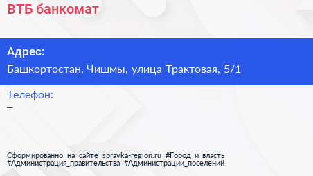 ВТБ, банкомат по адресу Башкортостан, Чишмы, улица Трактовая, 5/1 в дальнейшем Организация, размещена в следующих категориях: