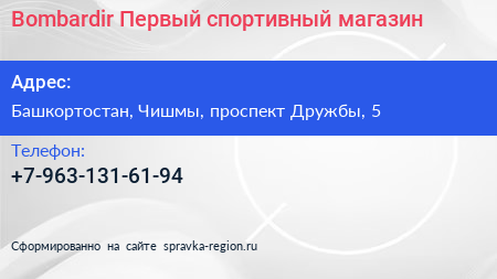 Bombardir. Первый спортивный, магазин по адресу Башкортостан, Чишмы, проспект Дружбы, 5 в дальнейшем Организация, размещена в следующих категориях: