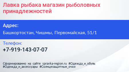 Лавка рыбака, магазин рыболовных принадлежностей по адресу Башкортостан, Чишмы, Первомайская, 51/1 в дальнейшем Организация, размещена в следующих категориях: