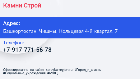 Камни Строй по адресу Башкортостан, Чишмы, Кольцевая 4-й квартал, 7 в дальнейшем Организация, размещена в следующих категориях: