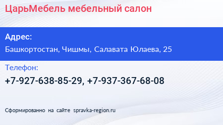 ЦарьМебель, мебельный салон по адресу Башкортостан, Чишмы, Салавата Юлаева, 25 в дальнейшем Организация, размещена в следующих категориях: