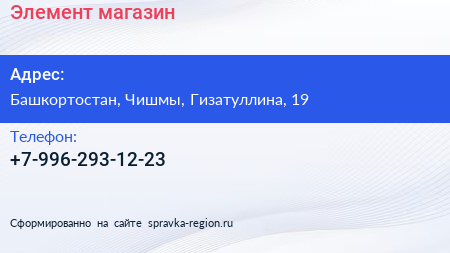 Элемент, магазин по адресу Башкортостан, Чишмы, Гизатуллина, 19 в дальнейшем Организация, размещена в следующих категориях: