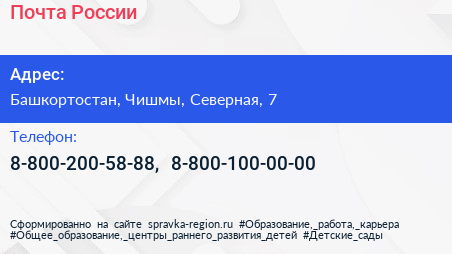 Почта России по адресу Башкортостан, Чишмы, Северная, 7 в дальнейшем Организация, размещена в следующих категориях: