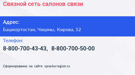Связной, сеть салонов связи по адресу Башкортостан, Чишмы, Кирова, 52 в дальнейшем Организация, размещена в следующих категориях: