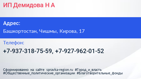 ИП Демидова Н.А. по адресу Башкортостан, Чишмы, Кирова, 17 в дальнейшем Организация, размещена в следующих категориях: