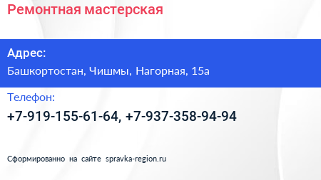 Ремонтная мастерская по адресу Башкортостан, Чишмы, Нагорная, 15а в дальнейшем Организация, размещена в следующих категориях: