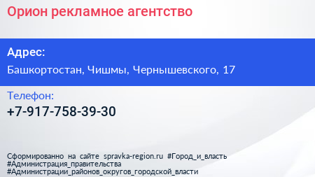 Орион, рекламное агентство по адресу Башкортостан, Чишмы, Чернышевского, 17 в дальнейшем Организация, размещена в следующих категориях: