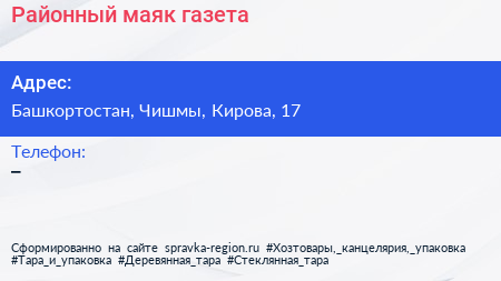 Районный маяк, газета по адресу Башкортостан, Чишмы, Кирова, 17 в дальнейшем Организация, размещена в следующих категориях: