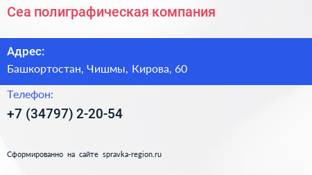 Сеа, полиграфическая компания по адресу Башкортостан, Чишмы, Кирова, 60 в дальнейшем Организация, размещена в следующих категориях: