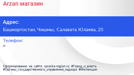 Arzan, магазин по адресу Башкортостан, Чишмы, Салавата Юлаева, 25 в дальнейшем Организация, размещена в следующих категориях:
