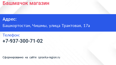 Башмачок, магазин по адресу Башкортостан, Чишмы, улица Трактовая, 17а в дальнейшем Организация, размещена в следующих категориях: