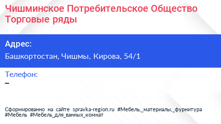 Чишминское Потребительское Общество, Торговые ряды по адресу Башкортостан, Чишмы, Кирова, 54/1 в дальнейшем Организация, размещена в следующих категориях: