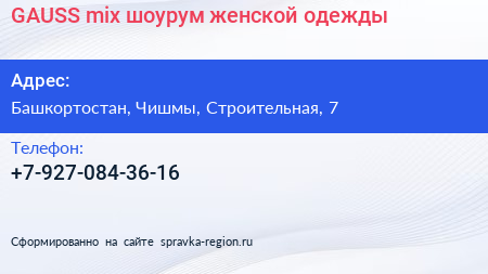 GAUSS mix, шоурум женской одежды по адресу Башкортостан, Чишмы, Строительная, 7 в дальнейшем Организация, размещена в следующих категориях: