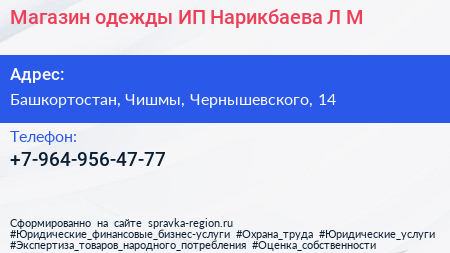 Магазин одежды, ИП Нарикбаева Л.М. по адресу Башкортостан, Чишмы, Чернышевского, 14 в дальнейшем Организация, размещена в следующих категориях:
