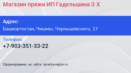 Магазин пряжи, ИП Гадельшина З.Х. по адресу Башкортостан, Чишмы, Чернышевского, 17 в дальнейшем Организация, размещена в следующих категориях:
