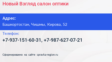 Новый Взгляд, салон оптики по адресу Башкортостан, Чишмы, Кирова, 52 в дальнейшем Организация, размещена в следующих категориях: