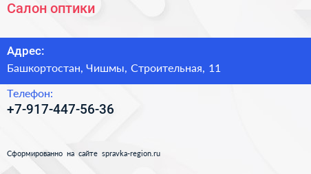 Салон оптики по адресу Башкортостан, Чишмы, Строительная, 11 в дальнейшем Организация, размещена в следующих категориях: