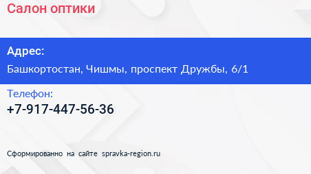 Салон оптики по адресу Башкортостан, Чишмы, проспект Дружбы, 6/1 в дальнейшем Организация, размещена в следующих категориях: