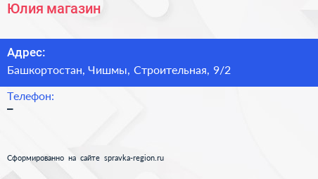 Юлия, магазин по адресу Башкортостан, Чишмы, Строительная, 9/2 в дальнейшем Организация, размещена в следующих категориях: