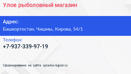 Улов, рыболовный магазин по адресу Башкортостан, Чишмы, Кирова, 54/1 в дальнейшем Организация, размещена в следующих категориях: