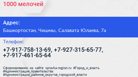 1000 мелочей по адресу Башкортостан, Чишмы, Салавата Юлаева, 7а в дальнейшем Организация, размещена в следующих категориях: