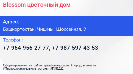 Blossom, цветочный дом по адресу Башкортостан, Чишмы, Шоссейная, 9 в дальнейшем Организация, размещена в следующих категориях:
