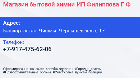 Магазин бытовой химии, ИП Филиппова Г.Ф. по адресу Башкортостан, Чишмы, Чернышевского, 17 в дальнейшем Организация, размещена в следующих категориях: