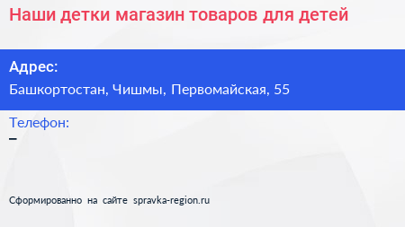 Наши детки, магазин товаров для детей по адресу Башкортостан, Чишмы, Первомайская, 55 в дальнейшем Организация, размещена в следующих категориях: