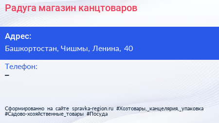 Радуга, магазин канцтоваров по адресу Башкортостан, Чишмы, Ленина, 40 в дальнейшем Организация, размещена в следующих категориях: