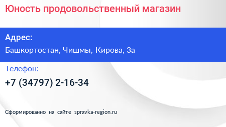 Юность, продовольственный магазин по адресу Башкортостан, Чишмы, Кирова, 3а в дальнейшем Организация, размещена в следующих категориях: