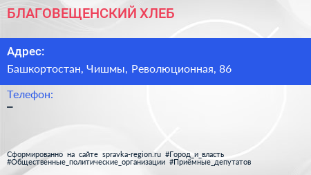 БЛАГОВЕЩЕНСКИЙ ХЛЕБ по адресу Башкортостан, Чишмы, Революционная, 86 в дальнейшем Организация, размещена в следующих категориях: