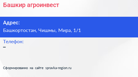 Башкир-агроинвест по адресу Башкортостан, Чишмы, Мира, 1/1 в дальнейшем Организация, размещена в следующих категориях: