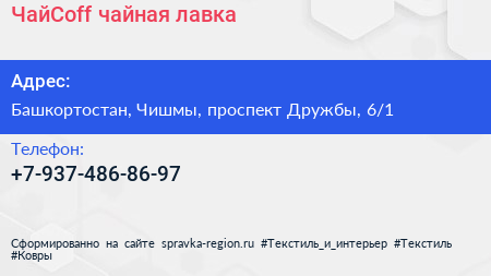 ЧайCoff, чайная лавка по адресу Башкортостан, Чишмы, проспект Дружбы, 6/1 в дальнейшем Организация, размещена в следующих категориях:
