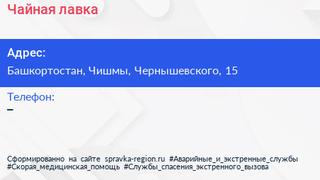 Чайная лавка по адресу Башкортостан, Чишмы, Чернышевского, 15 в дальнейшем Организация, размещена в следующих категориях:
