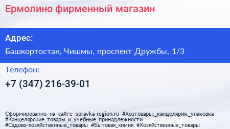 Ермолино, фирменный магазин по адресу Башкортостан, Чишмы, проспект Дружбы, 1/3 в дальнейшем Организация, размещена в следующих категориях: