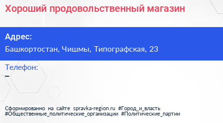 Хороший, продовольственный магазин по адресу Башкортостан, Чишмы, Типографская, 23 в дальнейшем Организация, размещена в следующих категориях: