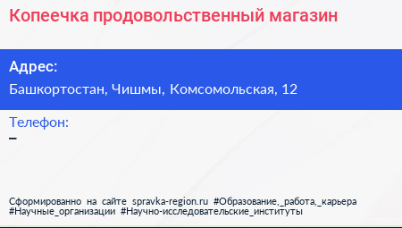 Копеечка, продовольственный магазин по адресу Башкортостан, Чишмы, Комсомольская, 12 в дальнейшем Организация, размещена в следующих категориях: