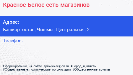 Красное & Белое, сеть магазинов по адресу Башкортостан, Чишмы, Центральная, 2 в дальнейшем Организация, размещена в следующих категориях: