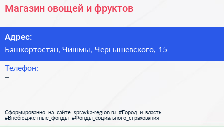 Магазин овощей и фруктов по адресу Башкортостан, Чишмы, Чернышевского, 15 в дальнейшем Организация, размещена в следующих категориях: