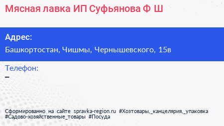 Мясная лавка, ИП Суфьянова Ф.Ш. по адресу Башкортостан, Чишмы, Чернышевского, 15в в дальнейшем Организация, размещена в следующих категориях: