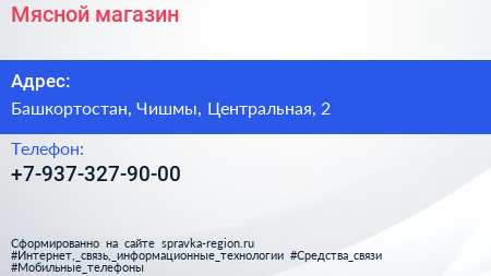 Мясной магазин по адресу Башкортостан, Чишмы, Центральная, 2 в дальнейшем Организация, размещена в следующих категориях: