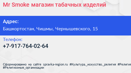 Mr. Smoke, магазин табачных изделий по адресу Башкортостан, Чишмы, Чернышевского, 15 в дальнейшем Организация, размещена в следующих категориях: